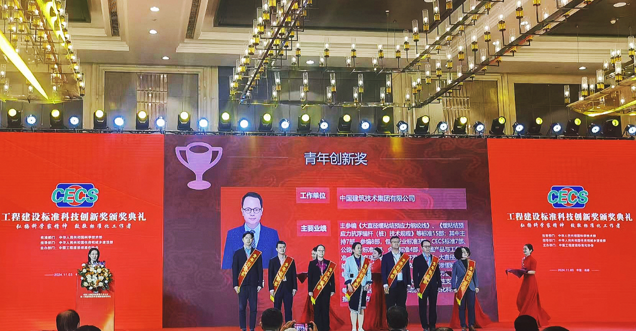 11月3日,2024年度中國工程建設(shè)標(biāo)準(zhǔn)化學(xué)術(shù)大會暨工程建設(shè)標(biāo)準(zhǔn)科技創(chuàng)新獎頒獎典禮在成都舉行。中國建技預(yù)應(yīng)力工程事業(yè)部總經(jīng)理蔣方新榮獲2024年度工程建設(shè)標(biāo)準(zhǔn)科技創(chuàng)新獎“青年創(chuàng)新獎”。
