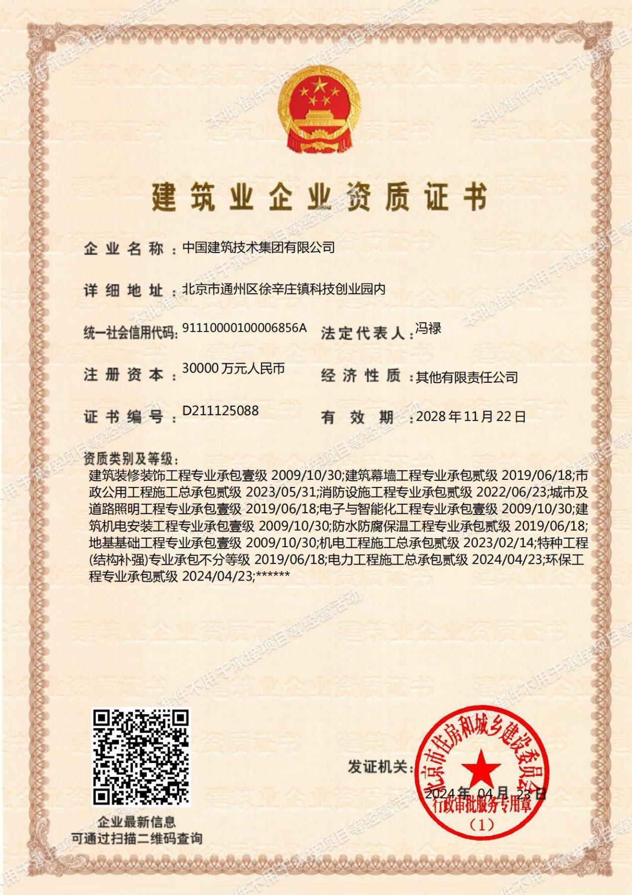 近年來,中國建技致力于完善資質(zhì)平臺建設(shè),形成了覆蓋規(guī)劃、勘察、設(shè)計、施工、監(jiān)理、咨詢、檢測與服務(wù)等領(lǐng)域的全產(chǎn)業(yè)鏈資質(zhì)矩陣。勘察設(shè)計領(lǐng)域,擁有工程勘察專業(yè)類(巖土工程)甲級、建筑行業(yè)(建筑工程)甲級、風(fēng)景園林工程設(shè)計專項甲級、城鄉(xiāng)規(guī)劃編制甲級、土地規(guī)劃乙級、測繪工程測量乙級、勞務(wù)類(工程鉆探)乙級等多項資質(zhì);工程施工領(lǐng)域,擁有建筑工程施工壹級、市政公用工程貳級、機電工程施工貳級、電力工程施工貳級四項總承包資質(zhì);鋼結(jié)構(gòu)、地基基礎(chǔ)、裝修裝飾、機電安裝、道路照明、電子與智能化等專業(yè)承包壹級資質(zhì);建筑幕墻、消防設(shè)施、防水防腐保溫等專業(yè)承包貳級資質(zhì);工程監(jiān)理領(lǐng)域,具備屋建筑工程監(jiān)理甲級資質(zhì),開創(chuàng)了以科研引領(lǐng)、設(shè)計助力、施工驅(qū)動的一體化經(jīng)營新局面。