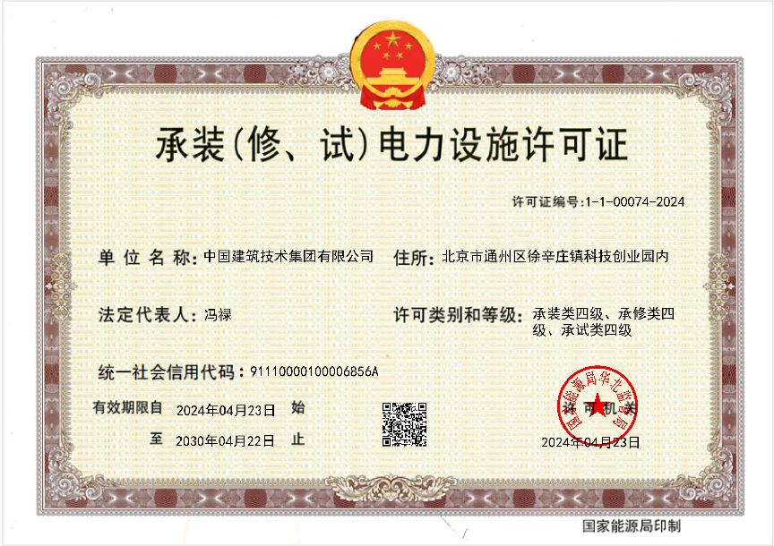 4月23日,經(jīng)北京市住房和城鄉(xiāng)建設(shè)委員會、國家能源局華北監(jiān)管局核準,中國建技申報的電力工程施工總承包貳級、環(huán)保工程專業(yè)承包貳級、承裝(修、試)電力設(shè)施許可證(四級)三項資質(zhì)成功獲批。