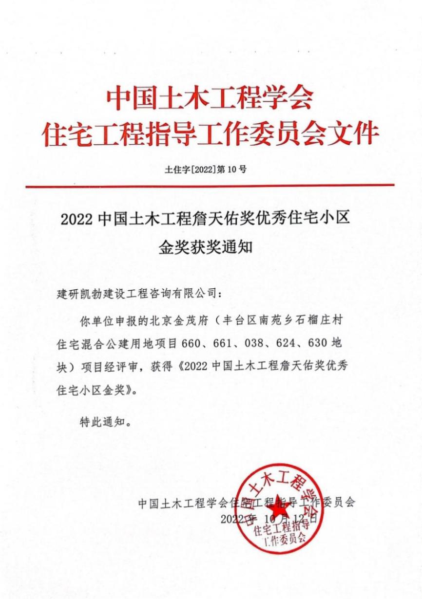近日,中國(guó)土木工程學(xué)會(huì)住宅工程指導(dǎo)工作委員會(huì)公布“2022中國(guó)土木工程詹天佑獎(jiǎng)優(yōu)秀住宅小區(qū)金獎(jiǎng)”評(píng)選結(jié)果建研凱勃公司監(jiān)理的“北京金茂府(豐臺(tái)區(qū)南苑鄉(xiāng)石榴莊村住宅混合公建用地項(xiàng)目660、661、038、624、630地塊)”工程榮獲“2022中國(guó)土木工程詹天佑獎(jiǎng)優(yōu)秀住宅小區(qū)金獎(jiǎng)”。