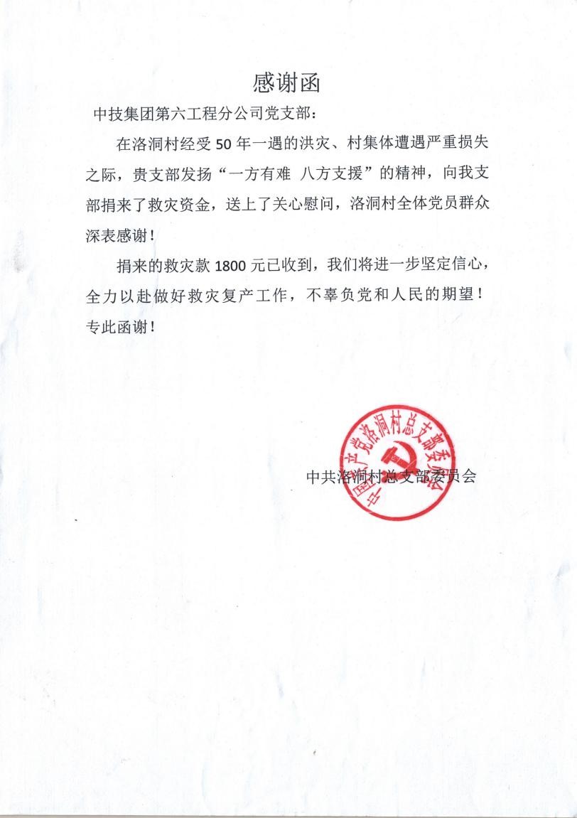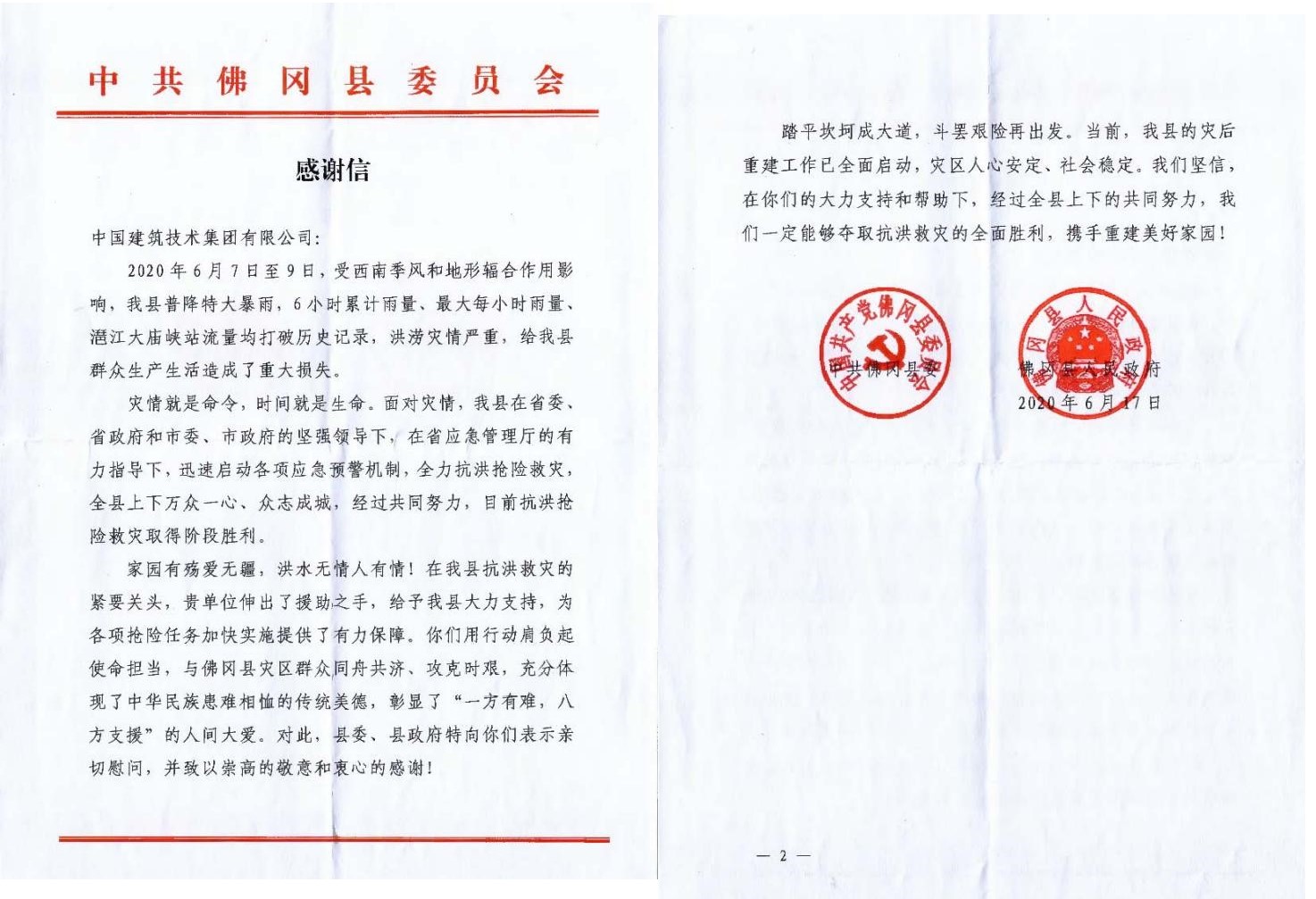 6月17日、6月23日第六工程分公司清遠(yuǎn)恒大御泉四季花園總承包項(xiàng)目部及第六工程分公司黨支部接連收到了清遠(yuǎn)市中共佛岡縣委、佛岡縣人民政府、中共洛洞村總支部委員會的感謝信,感謝信內(nèi)容主要是針對中技集團(tuán)清遠(yuǎn)恒大御泉四季花園總承包項(xiàng)目部及第六工程分公司黨支部在6月7日至6月9日清遠(yuǎn)市佛岡縣發(fā)生的50年一遇的洪災(zāi)中做出的巨大貢獻(xiàn)表示真誠的感謝。?