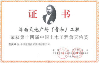 設(shè)計(jì)三所濟(jì)南天地廣場(chǎng)(貴和)項(xiàng)目 榮獲“第十四屆中國(guó)土木工程詹天佑獎(jiǎng)”