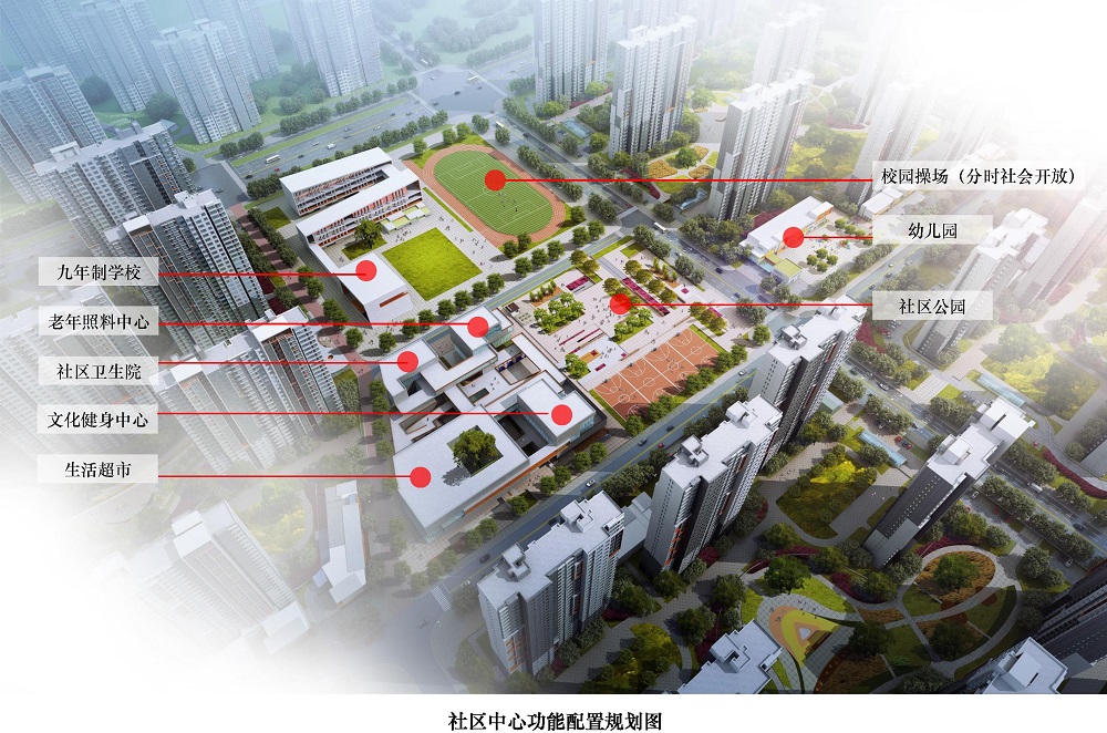 將生活超市、文化娛樂、全民健身、社區(qū)醫(yī)療、老年照料、九年制學(xué)校、社區(qū)公園、幼兒園和管理服務(wù)等社區(qū)類級的公共設(shè)施相對集中或鄰近布局,實現(xiàn)了便利化使用和規(guī)模化經(jīng)營的雙重目標(biāo)。規(guī)劃同時兼顧設(shè)施抗擾和共享平衡的問題:醫(yī)療、養(yǎng)老相互結(jié)合,教學(xué)設(shè)施相對獨(dú)立,學(xué)校操場臨近社區(qū)公園和文體中心布置,方便對外開放和聯(lián)動使用。