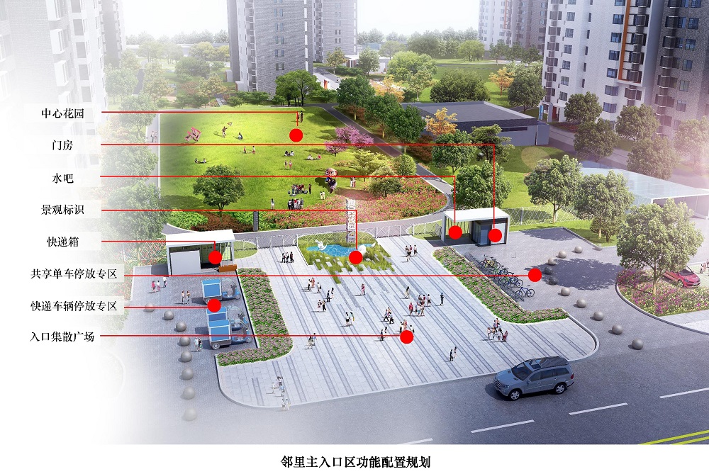 主入口實行人車分流組織,設(shè)置集散廣場、景觀標(biāo)識和中心花園。精細(xì)化布局門房、快遞箱、水吧、共享單車與快遞車輛停放專區(qū),形成功能強(qiáng)大的新型住區(qū)入口服務(wù)系統(tǒng)。