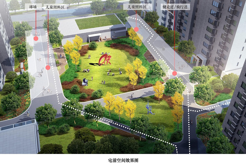 利用宅前消防登高場地規(guī)劃打球、健走、騎行和兒童照料等內(nèi)容,將宅前空間作為單元住戶的交往活力場所?;顒訄龅赝鈹U(kuò),結(jié)合綠化布置休閑座椅、花池廊架和文化藝術(shù)裝置,合理布局自行車棚、信報箱、垃圾收集箱和配電室等項設(shè)施。單元樓門設(shè)置入口標(biāo)識和門禁,居民活動也能對樓宇安全發(fā)揮良好的監(jiān)控作用。