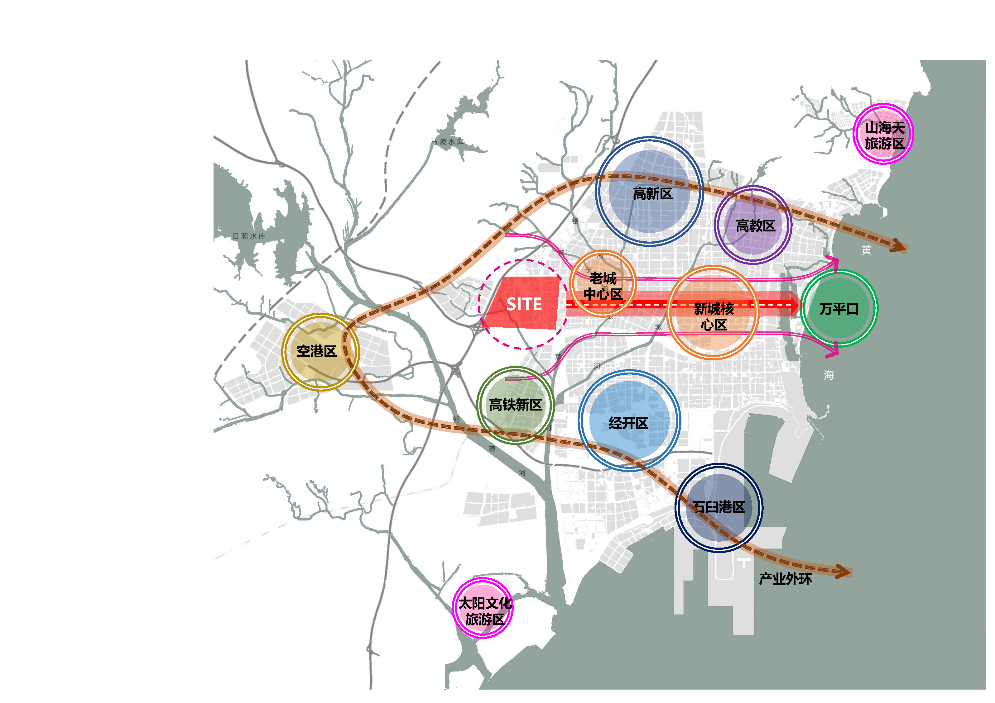 東港城西片區(qū)位于日照西部門戶,東臨老城中心,南臨高鐵片區(qū)、西有空港新城,北有高新區(qū),總面積7.17平方公里。對(duì)外通過高速、高鐵、機(jī)場(chǎng)與周邊區(qū)域城市緊密聯(lián)系。對(duì)內(nèi)山東路、海曲路、迎賓路三條東西向城市主干道與城市中心無縫對(duì)接,南北向合村路、丹陽(yáng)路與北部高新區(qū)、南部經(jīng)開區(qū)、臨港區(qū)一體化聯(lián)通。作為城市西部門戶,工業(yè)衰敗、設(shè)施老化、居住品質(zhì)下降已經(jīng)成為當(dāng)?shù)厝说钠毡橛∠?。在新的發(fā)展時(shí)期,城西片區(qū)將承載產(chǎn)城融合的歷史使命,實(shí)現(xiàn)城市品質(zhì)化擴(kuò)容的戰(zhàn)略支點(diǎn),迎來了實(shí)現(xiàn)歷史性跨越發(fā)展的關(guān)鍵機(jī)遇期。