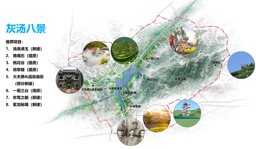 規(guī)劃形成“兩公園一小鎮(zhèn)、八景點一通廊”的空間結(jié)構(gòu),以紫龍湖為核心打造溫泉康養(yǎng)文化公園;結(jié)合東鶩山打造山地體育公園;結(jié)合灰湯鎮(zhèn)區(qū)打造灰湯溫泉民俗小鎮(zhèn);打“湯泉沸玉、鷹嘴石、桃花谷、將軍樓、大夫第&溫泉廟街、一里三臺、東鶩之眼、紫龍秘境”灰湯八景;依托烏江、紫龍湖、東鶩山形成山水景觀視線通廊。