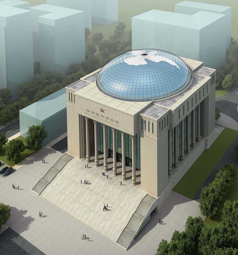 中國(guó)人民解放軍軍事醫(yī)學(xué)博物館位于北京市海淀區(qū)太平路,軍事醫(yī)學(xué)研究院內(nèi)西南角,是一座國(guó)家級(jí)大型軍事醫(yī)學(xué)類(lèi)博物館。建筑用地0.873公頃,總建筑面積38000平方米。主體建筑方正,頂部圓形玻璃穹頂直徑47米,表達(dá)了天圓地方的中國(guó)文化理念。穹頂玻璃幕結(jié)合太陽(yáng)能技術(shù),部分太陽(yáng)能反射板組成和平鴿圖案,寓意世界和平,表達(dá)了設(shè)計(jì)的主題。
