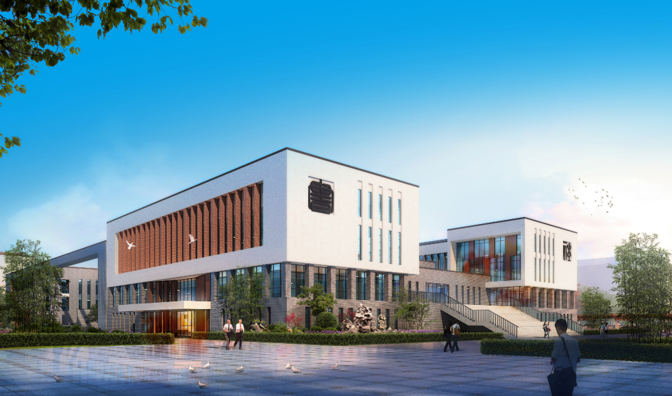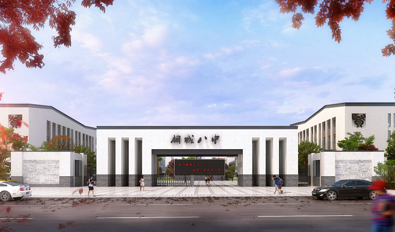建筑理念——校園的歷史原型:“辟雍”體現(xiàn)了“天圓地方”的中國傳統(tǒng)宇宙觀。整個校園立面材質(zhì)以黑、白、灰為基調(diào),取徽派建筑之精華、融合現(xiàn)代建筑設(shè)計手法,脫離于傳統(tǒng),不失其韻味。中心造型力求現(xiàn)代、空靈、內(nèi)蘊,輪廓線平緩、舒展,塑造出桐城市第八中學的現(xiàn)代風貌。布局上,中心雕塑作為整體校園的核心,圍繞中心雕塑設(shè)置行政綜合樓、高一、高二教學實驗樓和高三教學樓。